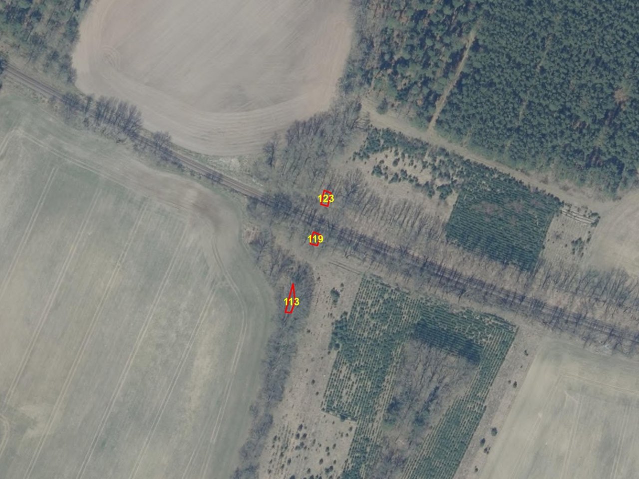 Gemäß vorliegendem Kartenmaterial sind die Flächen mit Bäumen bestanden. Informationen zur Bestockung liegen nicht vor. Das Flurstück 54 der Flur 3 erstreckt sich anteilig auf ein land- bzw. forstwirtschaftlichen Weg.