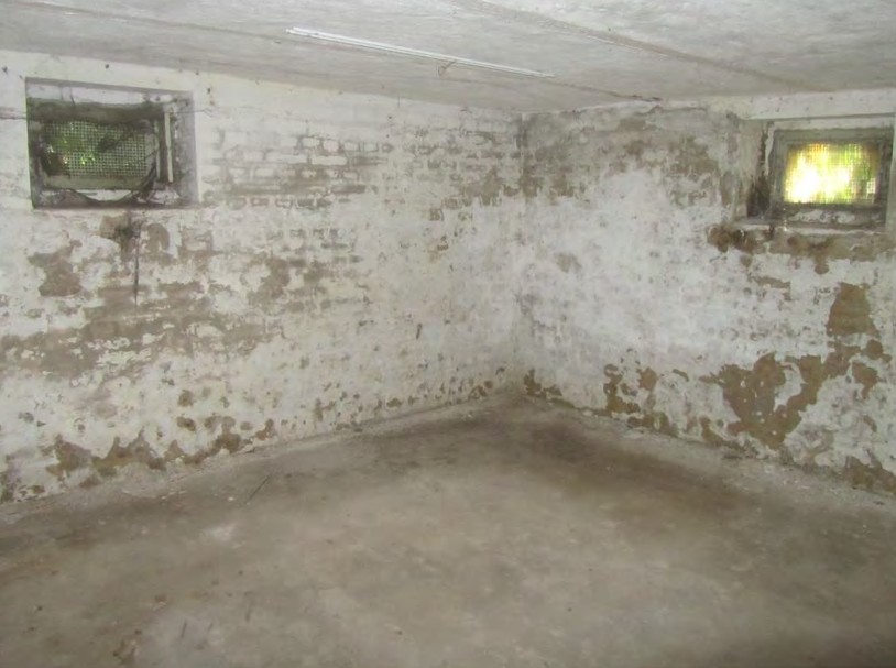 Estrichboden, verputztes oder gestrichenes Mauerwerk, massive Decke zwischen Eisenträgern, Metallrahmenfenster mit Schutzgittern