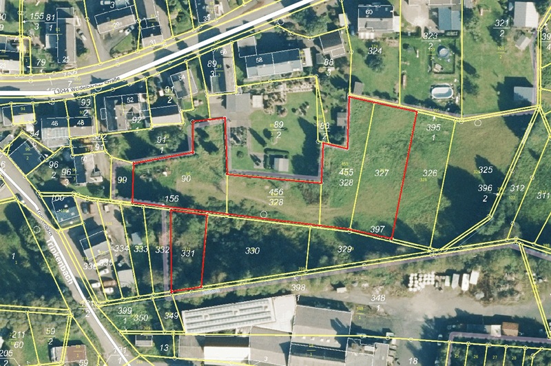 Die Verkaufsflurstücke befinden sich zwischen einem Wohn- und einem Gewerbegebiet und hier hinter bebauten Wohngrundstücken der Weidelbacher Straße 52, 54, 56, 58 und 60. Zu Gunsten des Flurstücks 90 ist in den Grundbüchern der Flurstücke 93/2, 92/1, 302/91, 96/3 und 99 ein Fahrtrecht eingetragen, damit besteht für das Flurstück 90 Anbindung an öffentliches Straßenland und die daran angrenzenden Verkaufsflurstücke 327, 455/328 und 456/328 sind ebenfalls erreichbar.