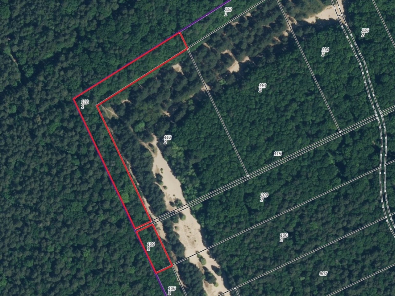 Zum Aufruf kommen die Flurstücke 112/1 (7.306 m²) und 109/1 (1.321 m²) der Flur 5 mit einer Grundstückgröße von insgesamt 8.627 m², jeweils lt. Grundbuchangabe. Der Verkaufsgegenstand sind 2 vertragsfreie Waldflächen, die durch ein schmales Fremdflurstück voneinander getrennt liegen.